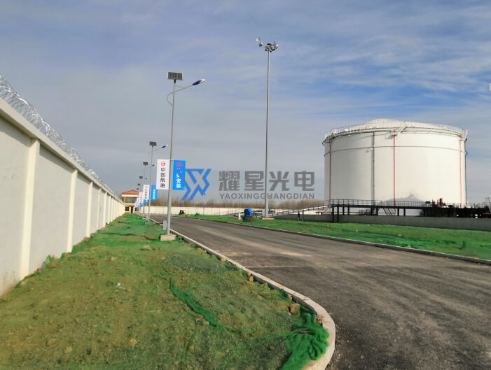 北京首都機場油庫區(qū)照明工程,場區(qū)共配置5套30米升降高桿燈和116套8米市電互補太陽能路燈